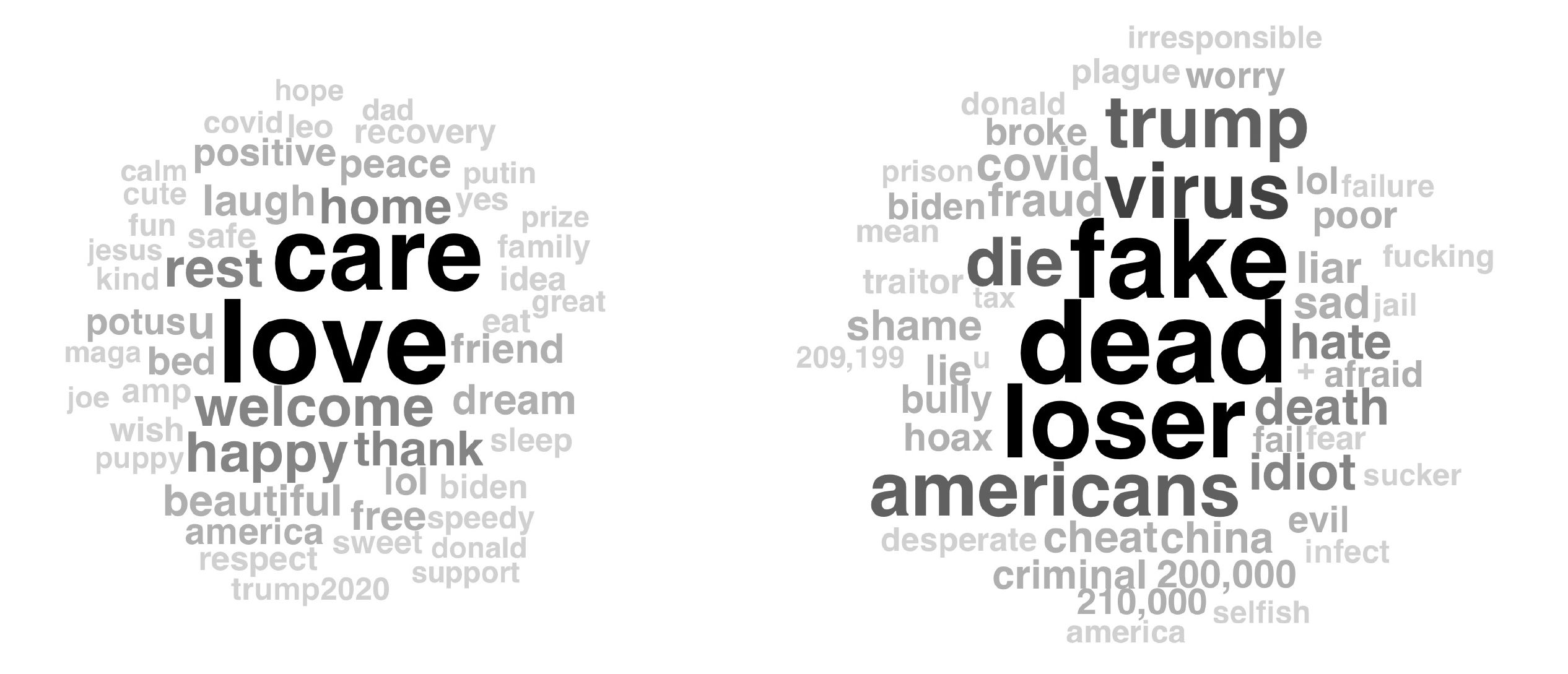 But what kind of language did tweeters use when talking about the president’s illness? Though the positivity towards Donald Trump increased overall, there remained a large number of Twitter users who did not wish the president well. A comparison of the words commonly used in the most positive (left) and negative (right) tweets shows this clearly. Trump is a divisive figure in both sickness and health.