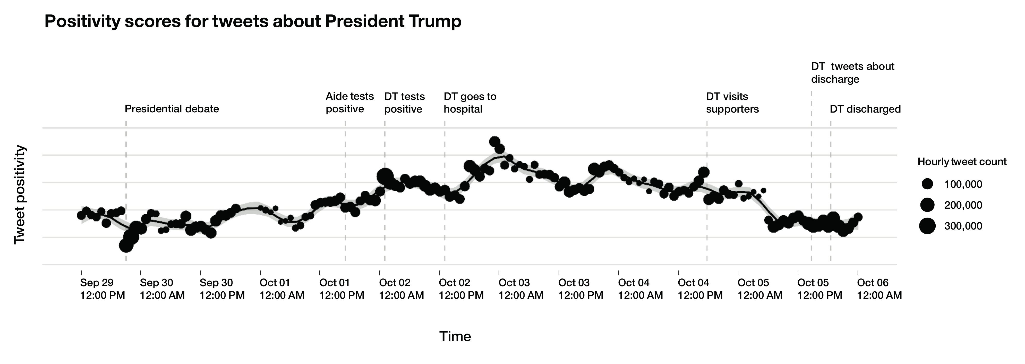 Analysis of 1.3 million tweets shows that Donald Trump enjoyed a net bounce in positivity following his diagnosis with Covid-19, but only until he was discharged from hospital. The language used in tweets also shows very polarized attitudes to his illness.